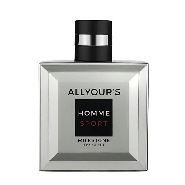 Allyours’s Homme Sport de Millestone es una fragancia masculina vibrante inspirada en Allure Homme Sport de Chanel. Presenta notas de salida cítricas y herbales como mandarina, menta, ciprés y salvia; un corazón especiado de pimienta; y una base amaderada cálida de sándalo, cedro, tonka y almizcle. Ideal para uso diario, tanto para día como noche durante primavera/verano. Origen: Emiratos Árabes Unidos