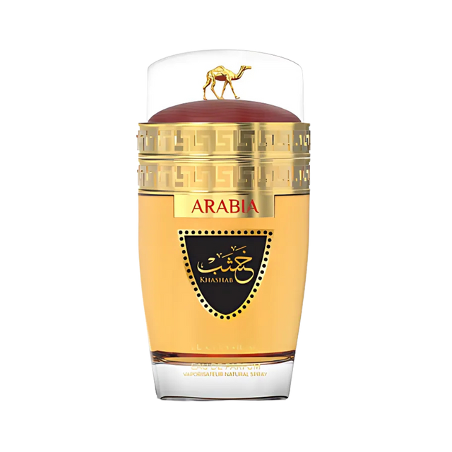 Arabia Khashab es una fragancia unisex sofisticada con notas de cuero y papiro en la salida, un corazón de cedro de Virginia y violeta, y una base cálida de cardamomo, iris y ámbar. Ideal para otoño e invierno, para salir de día o noche con elegancia distinguida.