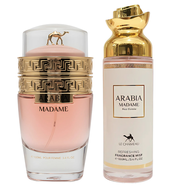 Arabia Madame es una fragancia femenina oriental floral lanzada en 2021, con notas de salida cítricas de naranja, limón y bergamota; un corazón floral compuesto por rosa, jazmín y pachulí; y una base dulce y sofisticada de vainilla y vetiver. Es perfecta para otoño e invierno, tanto para el día como para la noche, ideal para mujeres elegantes que buscan un aroma envolvente y sofisticado. Creada por Le Chameau (marca de Emper) en Dubái, Emiratos Árabes Unidos