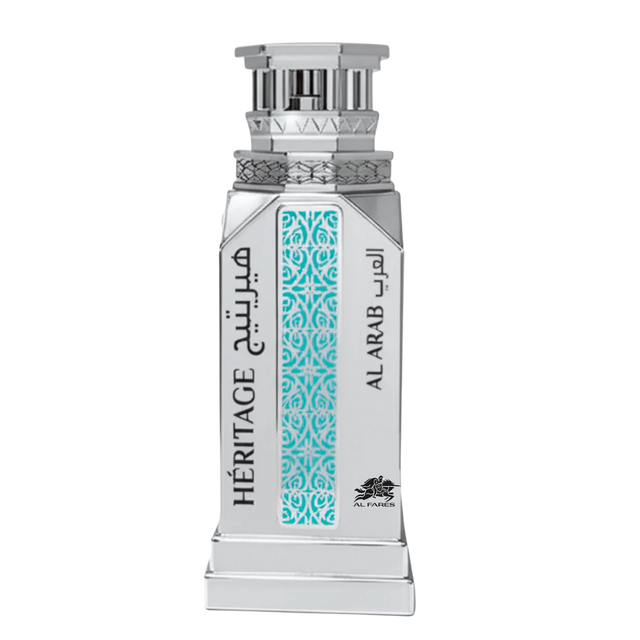 Heritage Al Arab de Al Fares es una fragancia unisex floral-afrutada con salida de manzana verde y melocotón, corazón dulce de rosa silvestre y jazmín, y base de almizcle, pachulí y rosa salvaje. Una composición fresca y elegante ideal para el día o eventos sociales en primavera‑verano. Origen: Emiratos Árabes Unidos