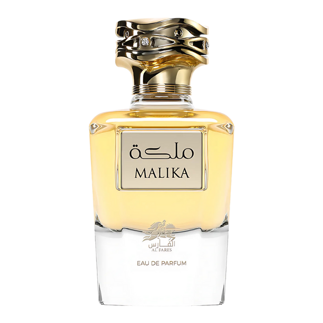 Malika de Al Fares es una fragancia unisex floral‑amaderada con apertura de azafrán y jazmín, corazón rico en amberwood, y fondo de resina de abeto y cedro que evoca realeza y sofisticación. Ideal para destacar en eventos formales. Origen: Emiratos Árabes Unidos