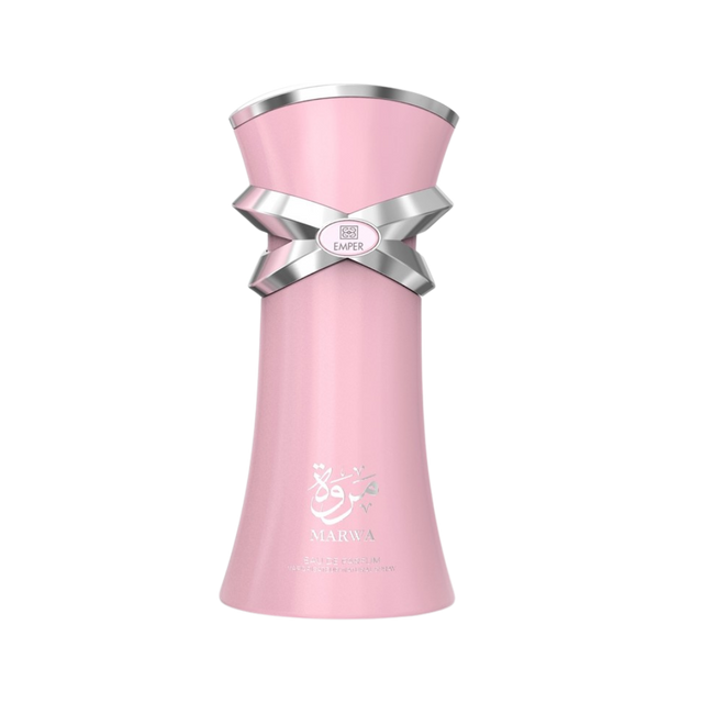 Marwa de Emper es una fragancia femenina gourmand-floral con notas de salida de pimienta rosa, melocotón y pera; corazón de rosa, frambuesa, flores blancas y jazmín; y fondo dulce de caramelo, vainilla, ámbar, pachulí y cedro virginia. Evoca elegancia y dulzura con un toque picante. Ideal para uso nocturno o citas especiales en otoño‑invierno. Origen: Emiratos Árabes Unidos